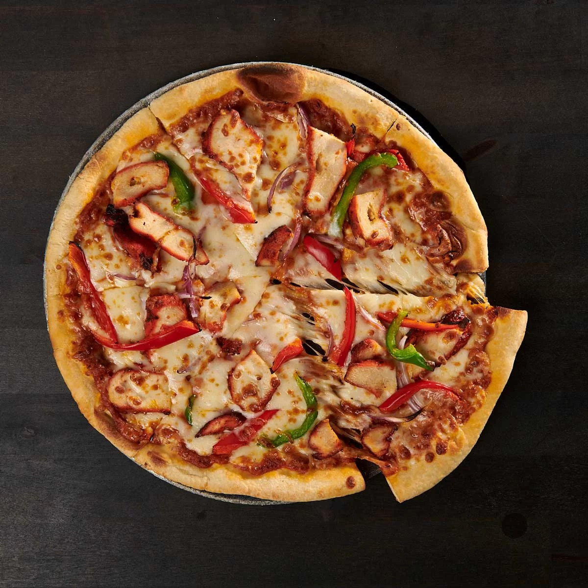 Experience the creamy, rich flavors of butter chicken on our tandoor-fired crust, complemented by tikka sauce, shredded mozzarella cheese, red onion, and a mix of peppers. A decadent choice for any meal.