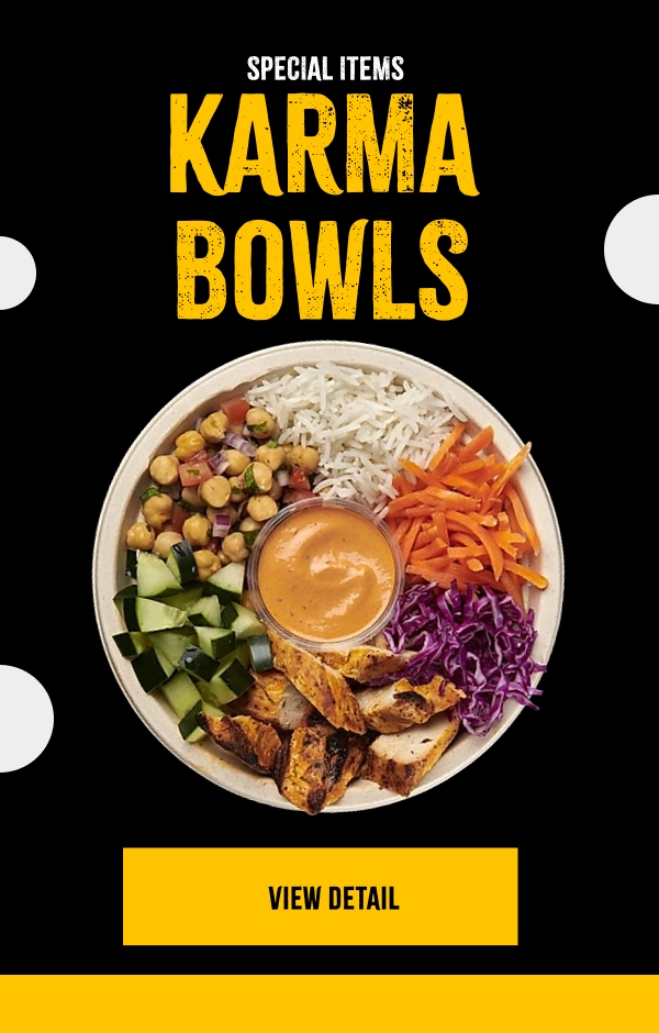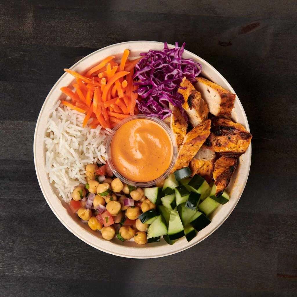 Tandoori chicken, fragrant Basmati rice, crisp cucumbers, colorful garbanzo salad, red cabbage, and carrots, all beautifully crowned with a bold chipotle aioli. A masterpiece of flavors and textures!