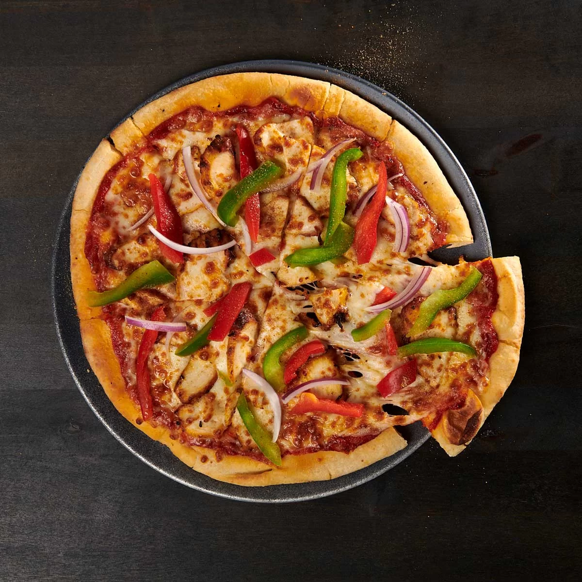 Boneless breast of free-range chicken marinated in Greek yogurt, garlic & a blend of fresh ground spices, roasted in our tandoor, with tomato- fenugreek sauce, fresh mozzarella & topped with lime-kissed onion-pepper medley (plain crust)