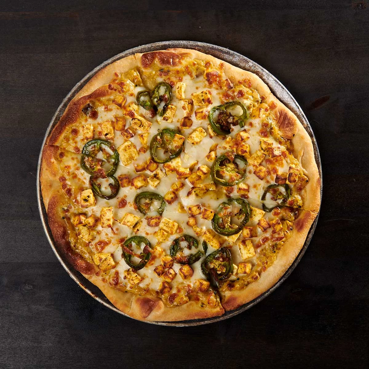 Firm non-melting cheese (aking to extra-firm tofy in texture) marinated in Greek yogurt & fresh gound spice, roasted jalapenos, with cocont curry sauce, whole milk provolone mozzarella blend (plain crust)