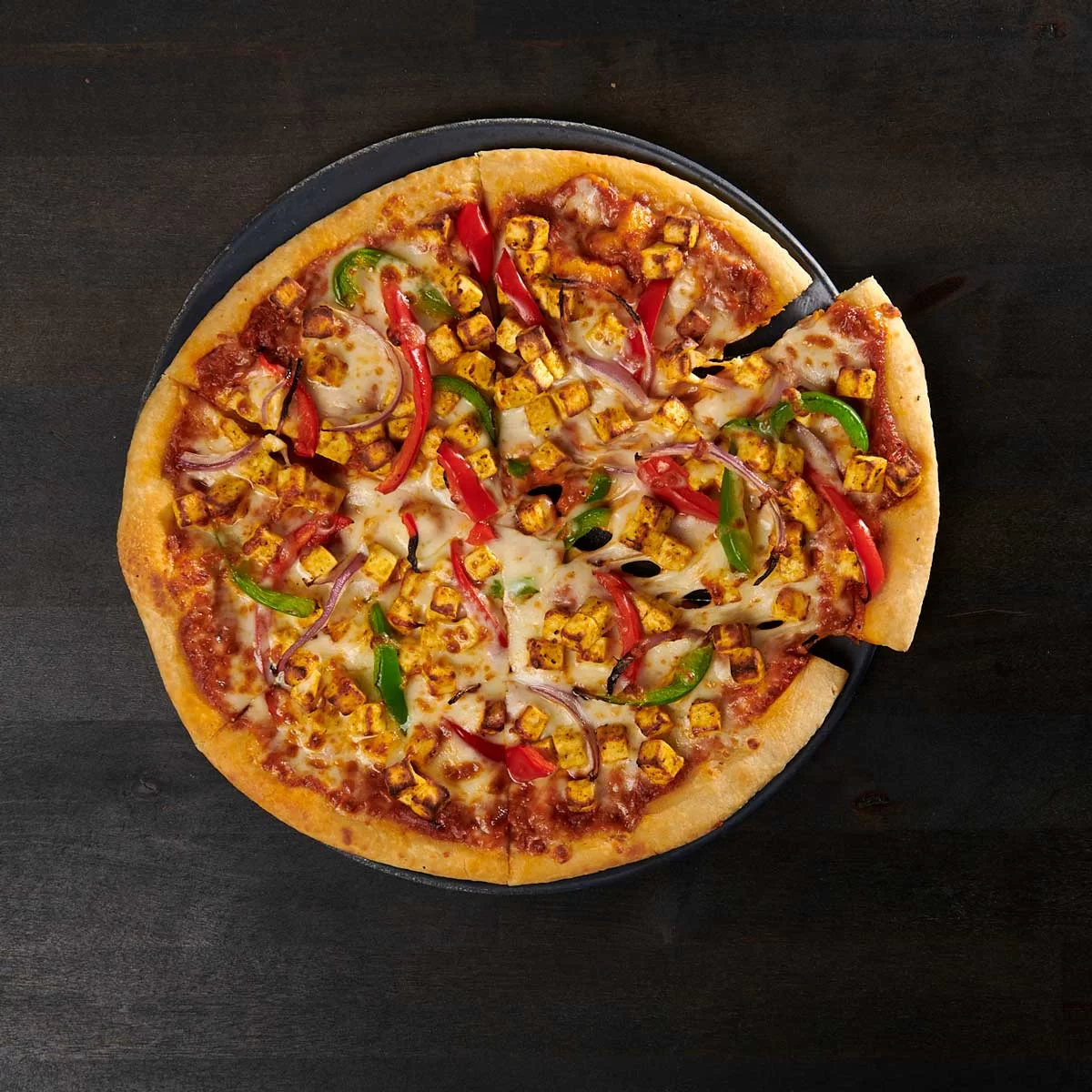 Firm non-melting cheese, tikka sauce, shredded mozza- rella topped with onion-pepper medley (plain crust)